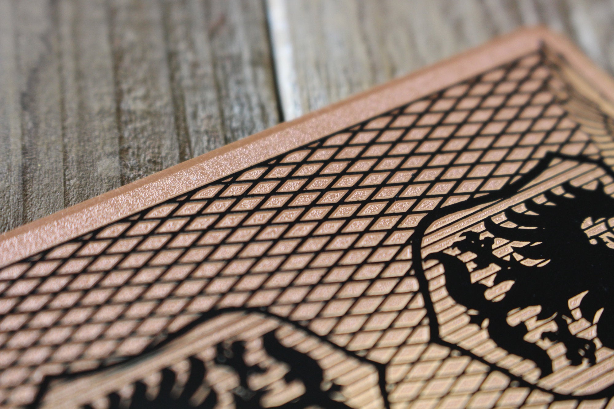This deck is designed with strong straight lines meant to be ridgid just like metal. The steel is etched with acid to create the art then heat printed with 4 color ink. The cards are slightly flexible but cannot be shuffled in a traditional matter.