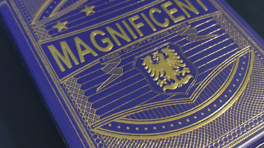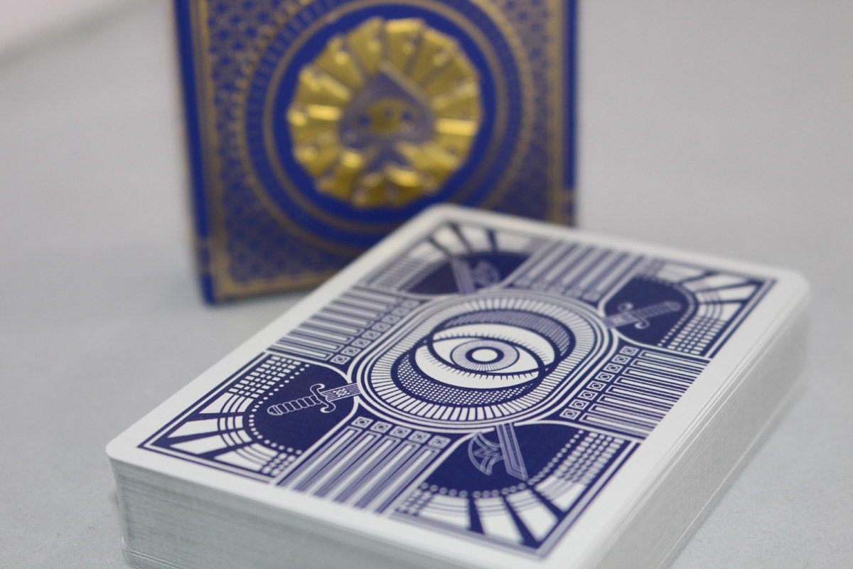 This is a beautiful hand inked deck of playing cards that was designed by Michael Scott. He designed it to be a luxury deck of playing cards with the unique characteristics of late 1800's decks. The tuck is a matte finish blue with gold foiled raised embossing for a brilliant finish. It has a longe tounge tuck case and comes seald with a gold foil stamp seal.